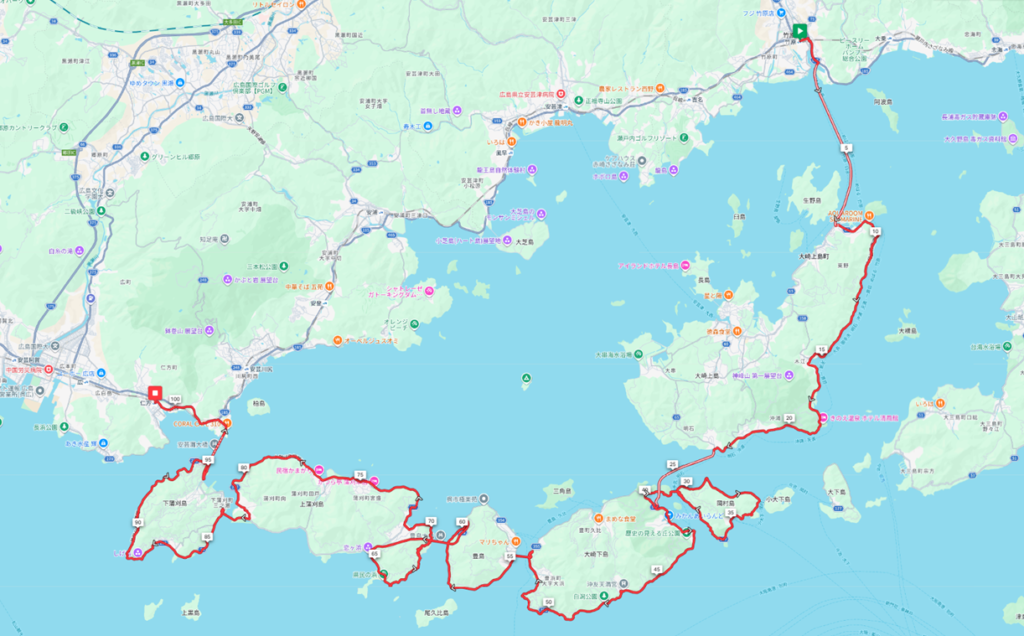 竹原港8:25―🚢山陽商船―>8:50垂水―🚲15km―>9:50明石港10:17―🚢土生商船―>10:32小長―🚲9km―>11:10岡村―🚲7km―>11:30御手洗―🚲13km―>12:30豊島―🚲10km―>13:00上蒲刈島―🚲19km―>14:30下蒲刈島―🚲14km―>15:20安芸灘大橋―🚲4km―>15:30仁方駅16:18―🚃JR―>17:04竹原駅―🚲2km―>17:30竹原港